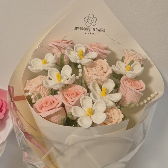 “The moment is here—the soft glow of candles, the quiet laughter shared between two hearts, the promise of forever whispered under the night sky. This handcrafted crochet bouquet isn’t just flowers; it’s a symbol of devotion, cherished memories, and the beauty of building a life together.